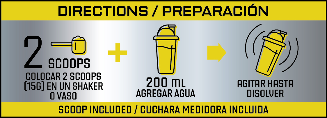 Por porción: 7 g Multi-step Carbo Complex (maltodextrina + dextrosa + isomaltulosa), creatina monohidrato 3000 mg, beta alanina 1500 mg, L-tirosina 500 mg, betaína anhidra 500 mg, taurina 500 mg, L-arginina AKG 400 mg, L-citrulina 400 mg, cafeína 200 mg, vitamina B3 (niacinamida) 16 mg, ácido pantoténico (pantotenato de calcio) 5 mg, vitamina D (colecalciferol) 5 Qg, vitamina B6 (clorhidrato de piridoxina) 1.3 mg, vitamina B1 (clorhidrato de tiamina) 1.2 mg, ácido fólico 240 Qg, biotina 30 Qg, vitamina B12 (cianocobalamina) 4.8 Qg. Contiene cafeína.